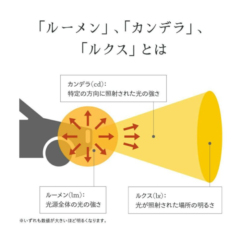 - lm(ルーメン): 光の総量を示す単位です。カタログスペックで最も多く使われています。