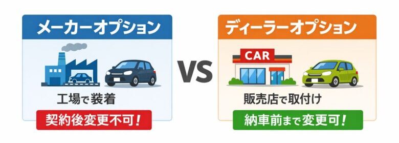 特にメーカーオプションは、「やっぱり後から付けたい」と思っても100%無理です。逆に、勢いで付けてしまった不要なメーカーオプションも、契約後は削れません。